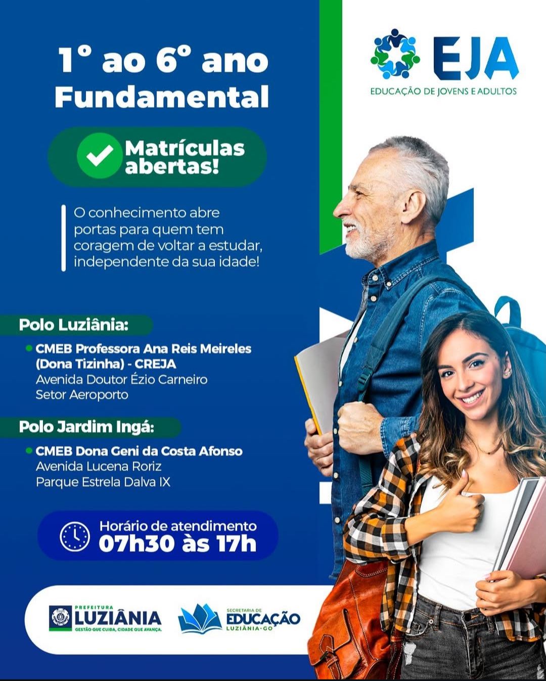 “A educação transforma vidas, abre portas e cria novas oportunidades, e a Prefeitura de Luziânia está aqui para caminhar com você nessa jornada. Vem para a EJA e comece agora a escrever um novo capítulo na sua história.”