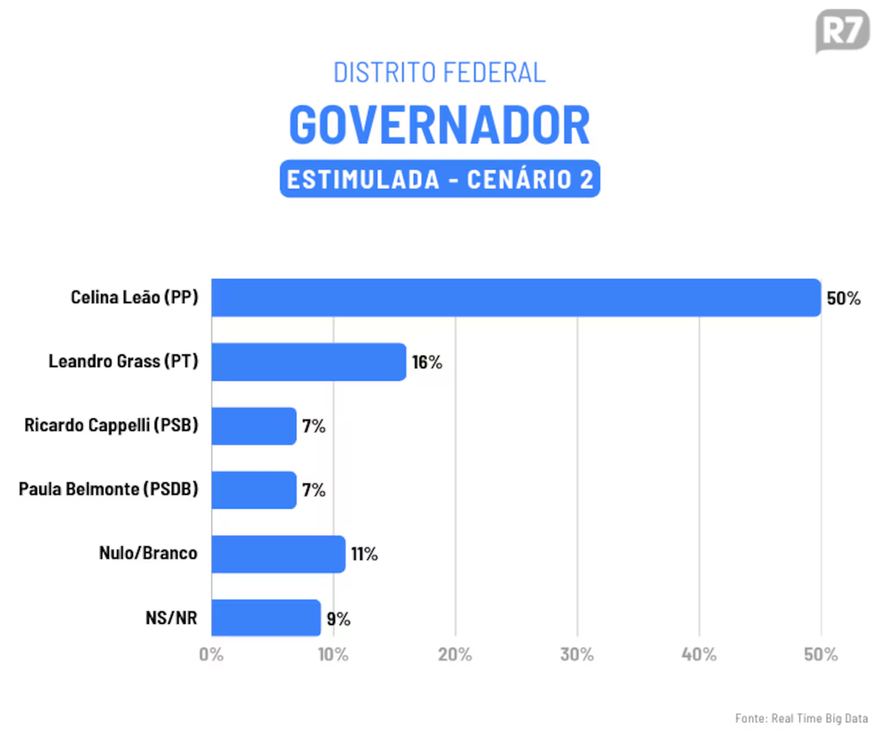 No segundo cenário, sem Arruda, Celina lidera com 50% das intenções de voto. Em seguida, Grass aparece com 16%, e Cappelli e Belmonte seguem empatados, ambos com 7%.
