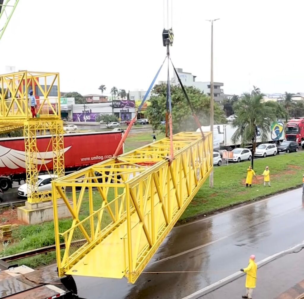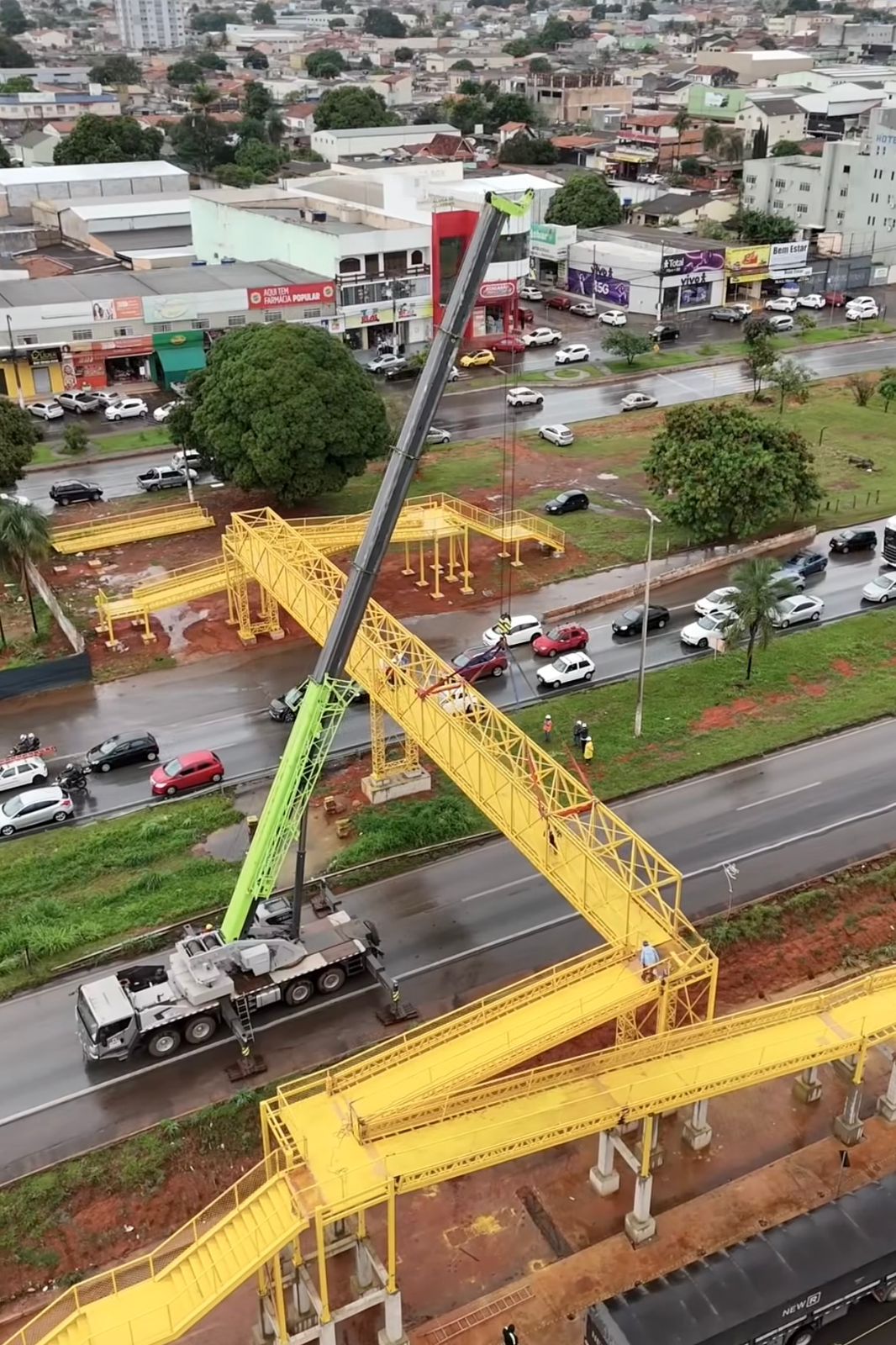 A nova passarela amarela instalada na BR-040, em Valparaíso de Goiás, está em fase final de acabamentos e será entregue à população no sábado, dia 20 de dezembro. Após a realocação e montagem no novo ponto, a estrutura se prepara para liberar a travessia de pedestres com mais segurança.
