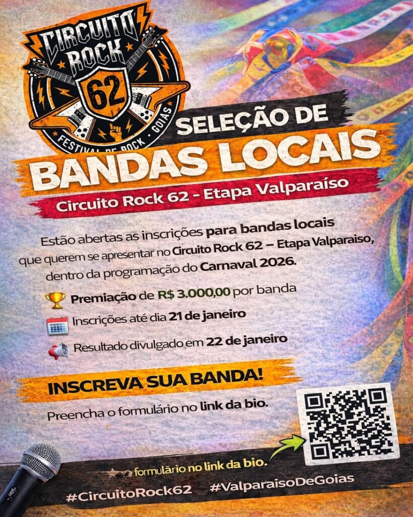 A Prefeitura de Valparaíso de Goiás anunciou a abertura das inscrições para a seleção de bandas locais que irão compor a programação do Circuito Rock 62 – Etapa Valparaíso, evento que integra as atrações do Carnaval 2026 e promete movimentar a cena cultural do município.