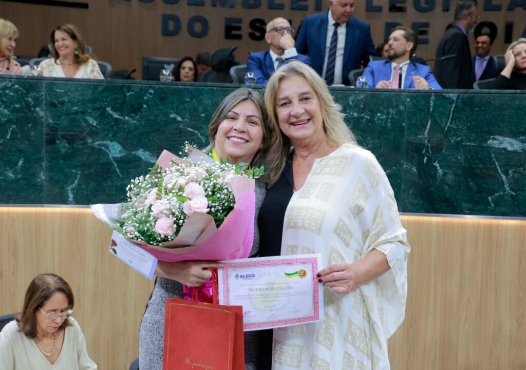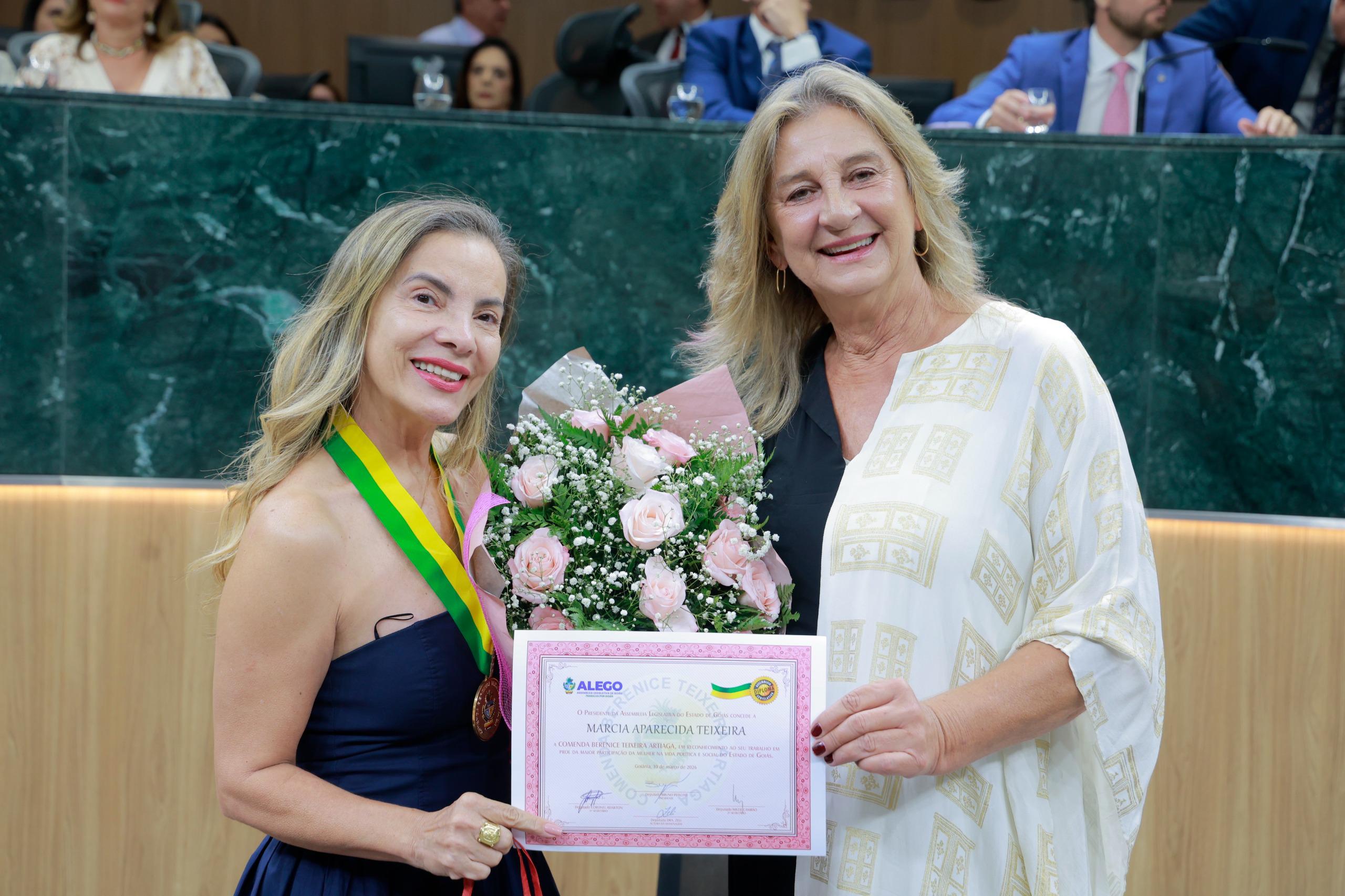 A advogada e professora Márcia Teixeira e a servidora da educação Iracema Maria de Lima receberam a maior honraria do Legislativo goiano durante sessão solene conduzida pelas deputadas estaduais e com presença do presidente da Casa, Bruno Peixoto