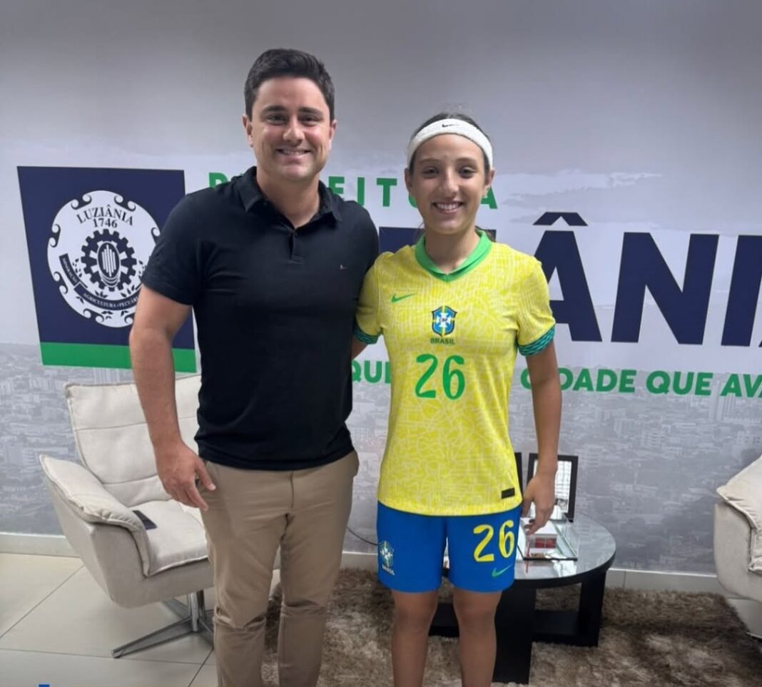 A adolescente Micaelly Galvão Nepomuceno Sipaúba, de apenas 13 anos, moradora do Jardim Ingá, foi homenageada na última quinta-feira (31) pelo prefeito de Luziânia, Diego Sorgatto, em reconhecimento à sua convocação para a Seleção Brasileira de Futebol Feminino Sub-15. O encontro no gabinete do chefe do Executivo marcou um momento de celebração pela conquista e reafirmou o compromisso da gestão municipal com o incentivo ao esporte de base.