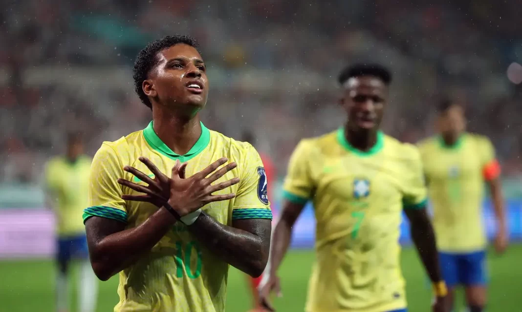 A seleção brasileira goleou a Coreia do Sul por 5 a 0 em partida amistosa, e mostrou que começa a evoluir sob o comando do técnico italiano Carlo Ancelotti quando falta pouco menos de um ano para o início da próxima Copa do Mundo. A principal virtude do Brasil, na partida disputada nesta sexta-feira (10) no Estádio da Copa do Mundo de Seul, em Seul, foi o bom entendimento do quarteto ofensivo formado por Estêvão, Matheus Cunha, Vinicius Júnior e Rodrygo.